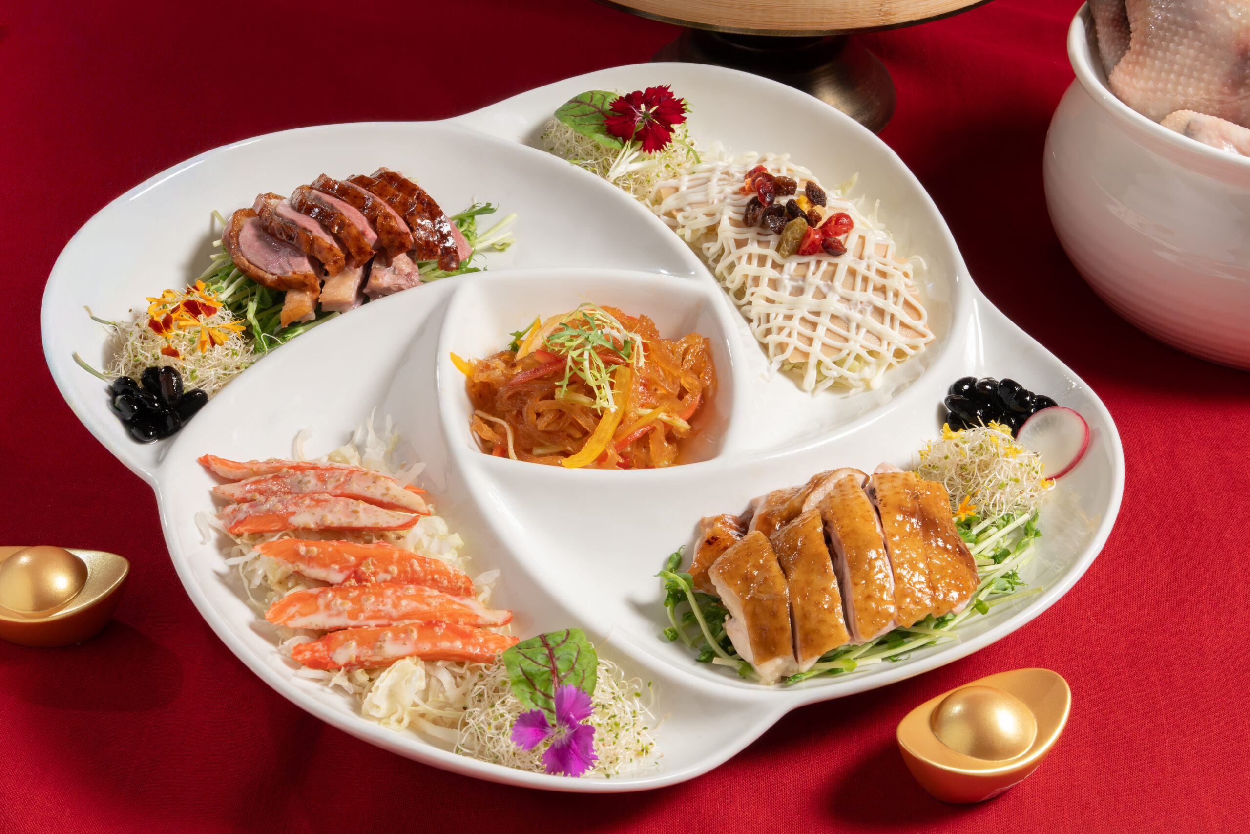 (玫瑰豉油雞/明爐掛燒鴨/涼拌海蜇絲/沙拉鮑魚片/胡麻蟳味棒)